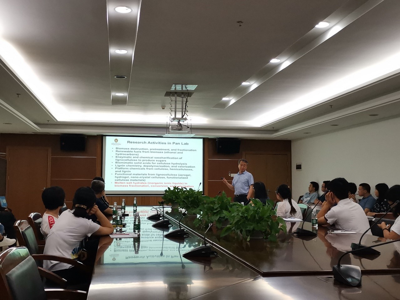 报告会上,王忠铭研究员对潘学军教授的来访表示热烈欢迎。潘学军教授对威廉康星麦迪逊大学进行了介绍,并作题为“Conversion and valorization of lignocellulosic biomass using inorganic ionic liquid”的学术报告,详细介绍了近年来利用无机离子液体对木质纤维素生物质进行分馏、转化和高值化利用的研究进展,包括纤维素的溶解和水解、生物质的糖化和分馏、葡萄糖异构化、糖/生物质向呋喃基化学品和碳氢化合物的转化、木质素的定量和解聚,以及纤维素II材料的制备。
