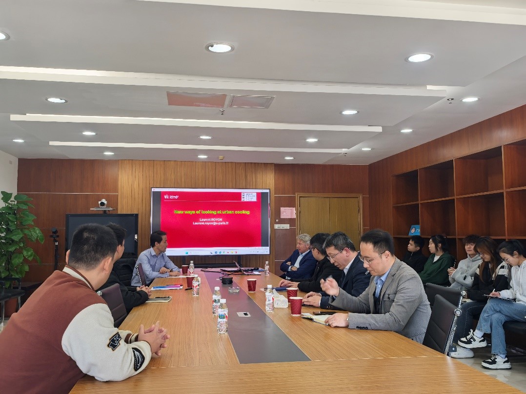 Laurent Royon以New ways of looking at urban cooling为题,介绍了巴黎为适应气候变化而采取的冷却散热方案,通过案例分析了城市新路面技术影响因素。同时,Laurent Royon还开展了辐射制冷与空气集水技术研究,重点考察大气窗口下有效辐射制冷能力、水滴(或薄膜)成核、单元结构等方面对集水的影响。报告会后,Laurent Royon还与参会人员在蒸发冷却、建筑节能等方面开展了交流与探讨,并参观了城乡矿山集成技术科研团队实验室。