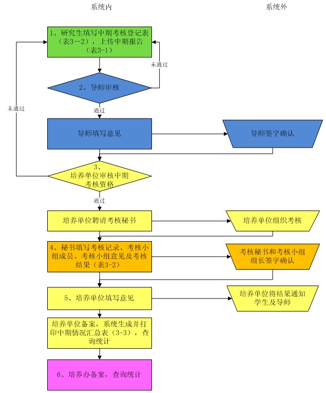 各位导师及同学们: 根据研究生培养方案和研究生中期考核暂行规定(详情请浏览所网研究生教育专栏)的要求,研究生进入研究课题一年及以上,须进行中期论文报告及评审。我所将以研究中心为单位在6月30日前对在读二年级研究生中期论文进行检查,检查通过者及时将中期报告一式两份交研究生部后获得1学分。评审小组由导师及同行专家(副研究员以上职称)3—5人组成,中期论文检查的内容和要求按附件中要求进行。请各位导师和同学配合。此项中期检查将作为研究生相对标准考核和导师完成指导工作的考核,请大家认真对待。 中期考核须在中科院研究生院教育业务管理平台https://www2.gucas.ac.cn/Casedu_Portal/Login_Jyyw.aspx 中填报和打印。学生初始用户名为学号、密码为身份证号,导师初始用户名为邮箱、密码为身份证号。具体流程见下表。 ![]()