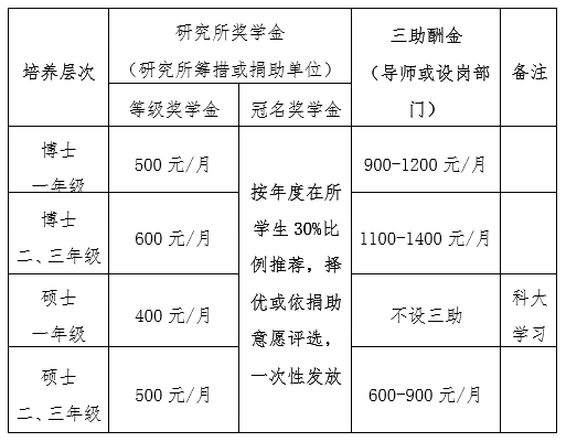 四、“国家助学金”,按照国家财政拨款统一标准实行。现行资助标准为,博士生12000元/年•生,硕士生6000元/年•生,覆盖100%研究生。研究所根据国科大制定《研究生国家助学金管理细则》,依据学籍管理负责实时核定,由国科大逐月发放。 五、“国家奖学金”,按照当年国家财政拨款额度及要求实施。现行标准为:博士生3万元/生、硕士生2万元/生,每年评选一次并覆盖约2-3%研究生。研究所根据《研究生国家奖学金评审实施办法》制定本所实施细则并组织初审,报国科大核准后由国科大一次性发放给获奖研究生。 六、“中科院奖学金”,是指中国科学院设立的各类优秀奖学金。按照院设立及冠名联合设立的相关意愿和要求,由院教育主管部门、国科大及中科院研究生教育基金会统筹安排。研究所按年度通知进行申报,由以上部门组织评选发放。 七、“国科大学业奖学金”,由国科大统筹国家财政拨款和学费收入设立,面向按统一规定缴纳学费的全日制研究生。具体由国科大按照博士生13000元/年•生、硕士生8000元/年•生的标准以及100%缴纳学费研究生规模,核定当年各研究所“国科大学业奖学金”总额;由研究所制定覆盖全体缴费研究生并有奖励级差的评定细则,报国科大备案批准。研究所每年9-10月开展评选工作,并于10月底前将评选结果报国科大;国科大11月一次性直接发放给获奖研究生。 八、“研究所奖学金”,是指由研究所自行设立的各类优秀奖学金,包括等级奖学金和冠名奖学金。由研究所筹措经费、按照冠名设立的相关意向和要求制定规则、组织评审、安排发放,并报国科大备案。 九、“三助酬金”,是指由学校职能部门、研究所、实验室、导师等根据工作需要,设置的“助研/助教/助管”岗位及相应酬金。按照岗位职责贡献与津贴待遇相对应的原则,由设岗部门负责筹措经费、设立岗位、确定职责、履行考核、安排发放。对于参与科研工作的“助研”岗位,由研究所制定最低标准,并报国科大备案。 在不影响正常科研工作的情况下,“三助”之间可交叉进行。“三助”酬金要与三助岗位任务相挂钩,实施任务合同的规范管理。设岗部门或课题项目负责人(导师),应将岗位及相应职责要求在单位内部予以公开,研究生须经导师同意后申请相应岗位,并与设岗部门或课题项目负责人、研究生部签署“三助”岗位任务合同书(见附件)。受聘“三助”岗位的研究生,须按岗位职责要求完成工作任务,接受考核。对于工作任务完成不好的研究生,“三助”酬金应予减发;对于不能履行岗位职责的研究生,“三助”酬金应予停发。当年毕业的研究生若到就业单位实习(一般不得超过两个月),须提前两周向导师提出书面申请,导师签名确认后交研究生部备案,从下月起停发“三助”酬金。 十、研究所为研究生根据广东省学生医保政策提供基本医疗保险。 十一、2014年9月及之后入学的研究生,在入学时按规定缴纳学费,并享受相应奖助学金。如确因家庭经济困难而不能在规定期限缴纳学费的,可以先办理入学手续,再按照规定程序提出减免学费的申请,由学校审核确定学费是否减免。学生缴纳学费的具体办法,由国科大另行制定。 十二、研究生在休学、因公出国期间(含国家留学基金资助、研究所资助和导师课题资助),暂停国家助学金、国家奖学金、国科大学业奖学金的发放,待其回国后恢复发放。 十三、对于因违纪违规违法行为而受到处分的研究生,在规定期限内取消各类奖学金的参评资格;已经获得的各类奖学金,在处分下达之日起停发。 十四、对于委托培养、定向培养、联合培养的研究生,统一向国科大缴纳学费。 十五、评选机构 本所研究生奖助学金评审委员会组成: 主 任:马隆龙 副主任:赵黛青 吴能友 成 员:李海滨 游亚戈 徐 刚 马伟斌 余颖琳 学生代表 评审委员会负责本单位各类奖助学金的评审等工作。办公室设在研究生部。 十五、参照国科大奖助学金标准相关要求,研究所制定自设奖学金及三助津贴的标准,详见下表。
