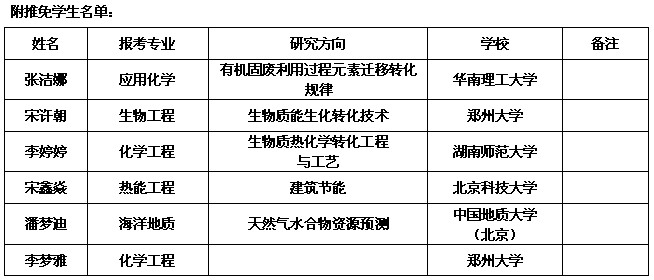 备注:1、参加推荐免试名单附后 2、参加推荐免试人员请携带身份证、一寸彩色照片一张、学生证和其他证明材料,务必带上学校教务处盖章的推免证明材料。 3、能源所不安排住宿,由学生自己承担住宿费、体检费等相关费用,体检费约120元。研究所附近有7天连锁酒店,请自行订房。 4、广州能源研究所具体地址:广州天河区能源路2号 1)从广州火车站坐257路公交车到天河客运站总站下车,过马路从BP加油站路口进入,步行15分钟即到 2)从广州火车东站乘41路短线公交车到华工大站下车,再由华工大正门乘坐校内公交车至华工大北门下车后,朝东直走5分钟即到 3)从新白云国际机场乘坐地铁3号北延段(体育西路方向)在燕塘站(C出口)下车,步行至燕塘企业站,乘坐28路、46路、84路、534路、54路、65路、B11路、297路公交车至天河客运站下车,从BP加油站路口进入,步行15分钟即到。 4)从火车南站乘坐地铁2号线(嘉禾望岗方向),在昌岗站换乘地铁8号线(万胜围方向),在客村站换乘地铁3号线(天河客运站方向)至天河客运站(B出口)出站,过马路从BP加油站路口进入,步行15分钟即到。 5、联系电话:020-87057626 张老师 6、请大家行程途中注意安全。