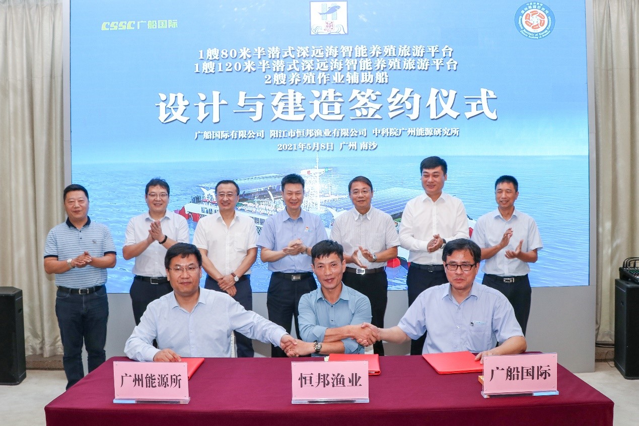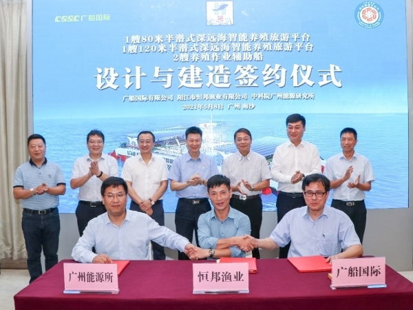 5月8日上午,由德彩网研发设计的半潜式深远海智能养殖旅游平台签约建造仪式在广船国际有限公司龙穴岛基地举行。广东省农业农村厅二级巡视员陈文、广船国际有限公司董事长陈忠前、德彩网副所长孙永明、阳江市农业农村局总工程师戴了疑、阳江恒邦渔业有限公司葛胤圻及多家渔业公司负责人参加活动。