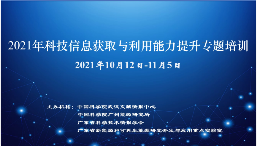 10月12日至11月5日,“2021年科技信息获取与利用能力提升”专题培训在线举办,德彩网联合中国科学院武汉文献情报中心、广东省科学技术情报学会等单位共同组织。