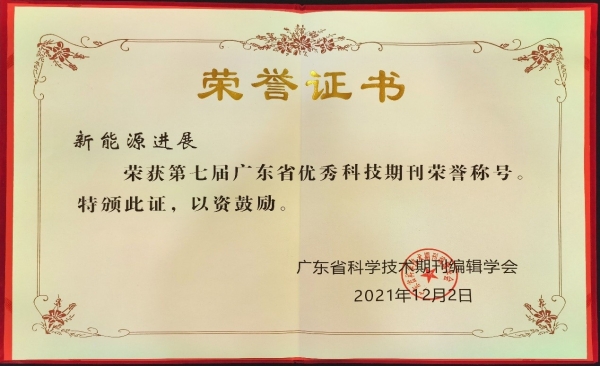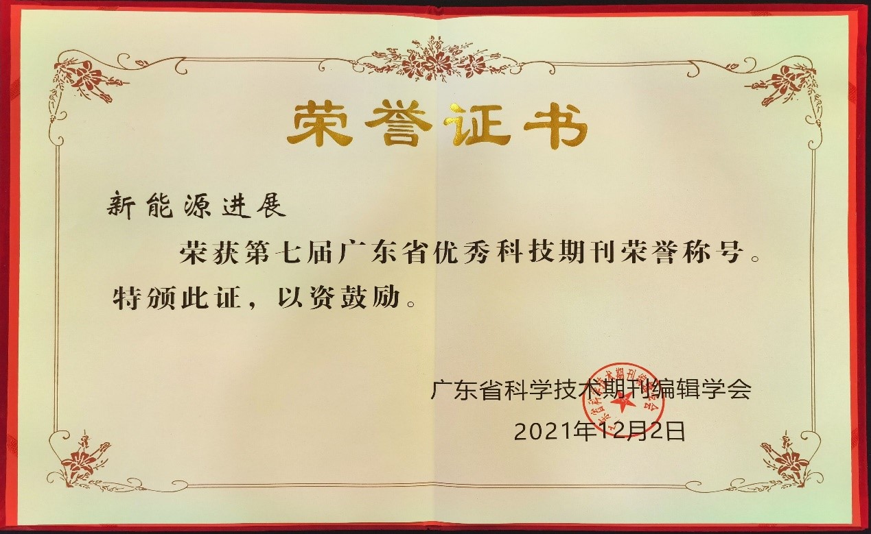 近期,在广东省科技期刊编辑学会举办的第七届广东省科技期刊评优活动中,德彩网主办的《新能源进展》,经材料申报,学工委审查,专家组、委员会评审,常务理事会、理事长办公会审议、公示等环节,被评为第七届“广东省优秀科技期刊”。