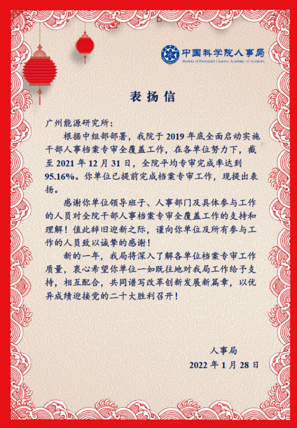 近日,中科院人事局对全院干部人事档案专审全覆盖工作完成情况进行通报,广州能源所获得院人事局表扬信书面表扬。