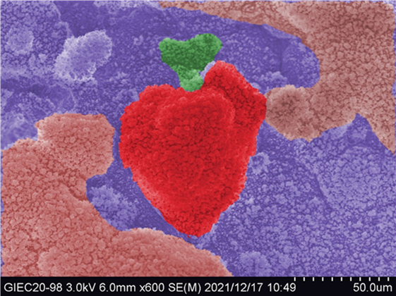 作品信息:在水过量的体系下合成水合物,经过液氮降温后会形成一系列冰粒包裹水合物的现象。如图所示,中心的“心形”是冰粒相互聚集形成的,这表明液氮降温前,此处还有大量的液态水。图中,一上一下像两只手,凸起的部分像大拇指,整张图酷似一双手掌捧着一颗成熟的草莓。在这个盛开的夏季,摘下的第一个草莓一定要亲手送给心爱的Ta。